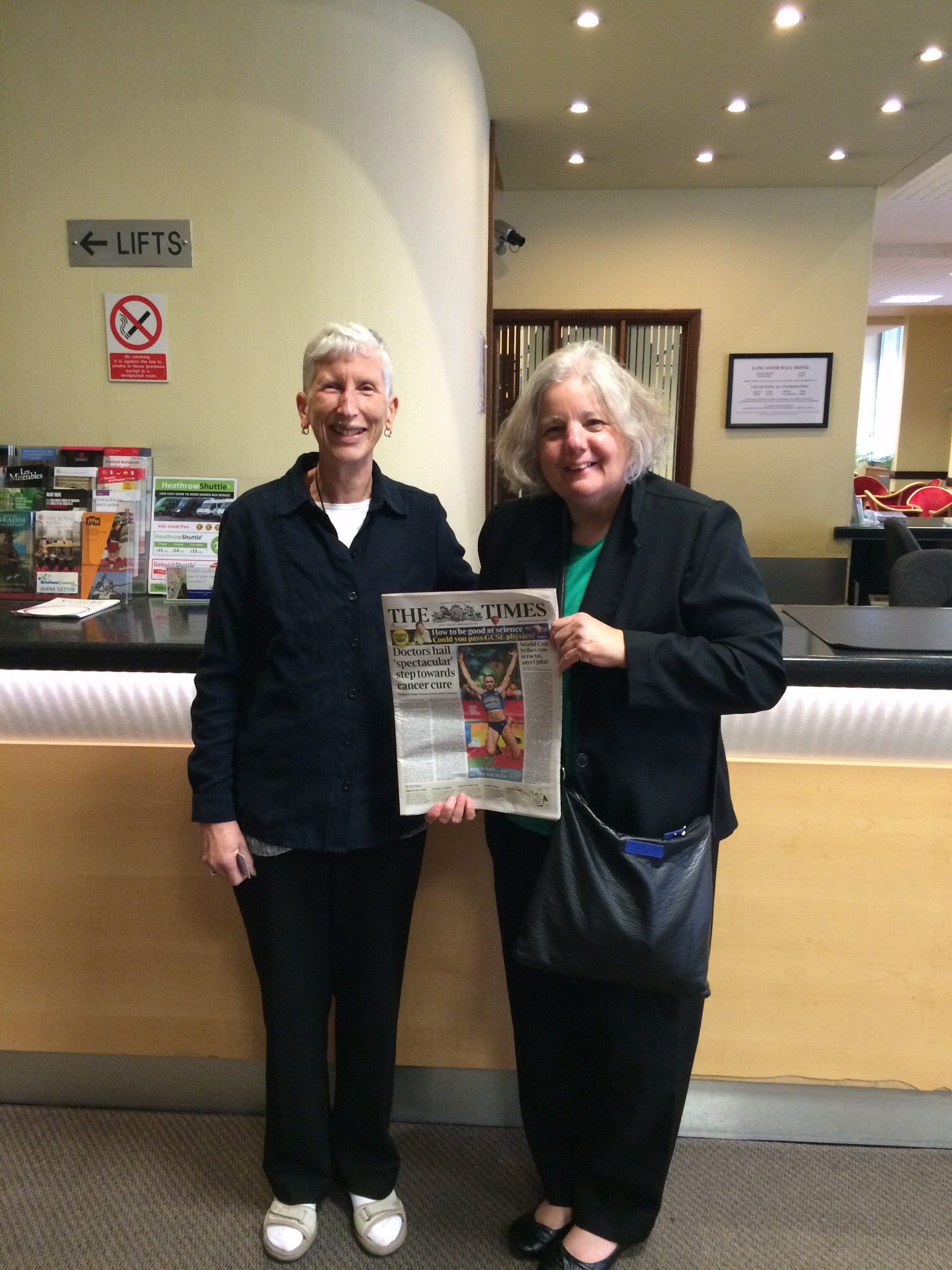 Mary and me in our “hotel” lobby with a copy of the The Times